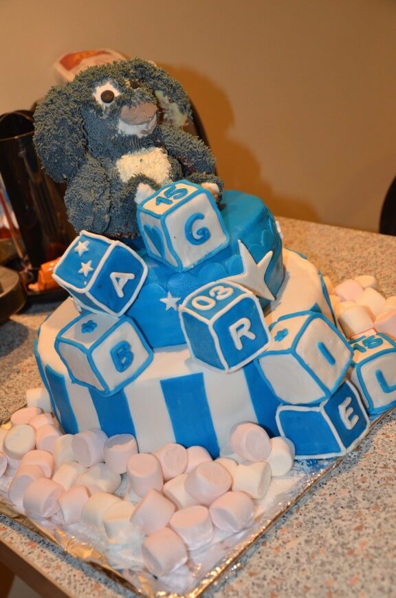 Voilà un peu plus de détail sur le gâteau réalisé pour le baptême de Gabriel. Gabriel ayant 18 mois je voulais rester dans un esprit bébé sans non plus rentrer dans un thème nourrisson. J’ai opté pour un gâteau bleu et blanc où trônerait une copie de son doudou et d’où tomberait des cubes avec son prénom.