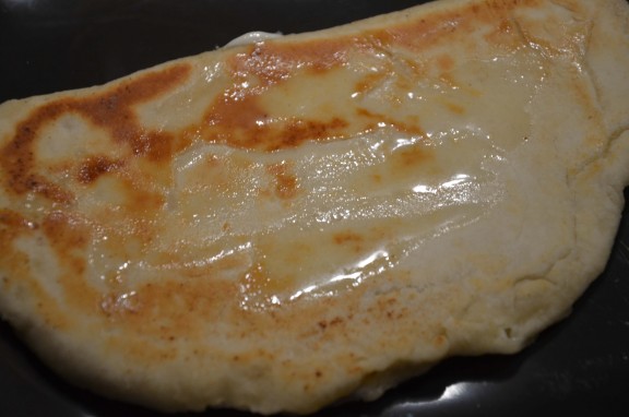 - Déposer l’équivalent de 2 portions de fromage sur chaque naan et replier en 2. Souder les bords