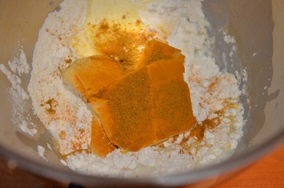- Mélanger 300 g farine, 8 cl de lait, 150 g de beurre, 2 g de curcuma et 1 g de curry. Je mélange tout au batteur K pendant quelques minutes, c’est très rapide, il faut juste attendre que tout ce soit bien amalgamé.