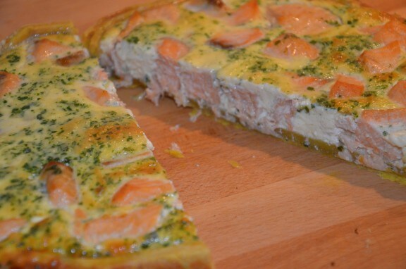 - A la fin de la cuisson de la pâte, déposer les dés de saumon, puis verser l’appareil