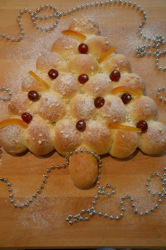 Pour la pâte,c’est une recette de pain au lait  façonnée en boules, et où on  introduit un carré de chocolat dans chaque petit pâton pour un esprit de l’Avent.