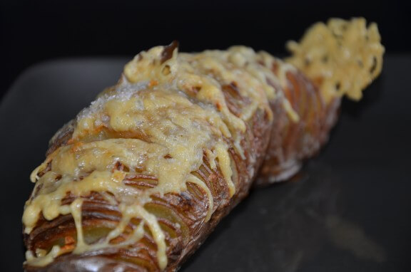 L’originalité de cette préparation se trouve dans la découpe des pommes de terre, puisque chacune est coupé en tranches très fines mais pas jusqu’au bout, ce qui permet à la pomme de terre, à la cuisson de s’ouvrir comme un éventail pour un joli rendu final.