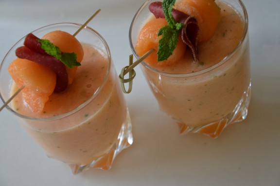 Ceci n’est pas vraiment une recette tellement c’est simple juste une idée !!  Le côté original de cette soupe de melon , c’est qu’on peut très bien la proposer en dessert , comme en apéritif ou entrée. Ici , je l’ai servi en entrée à mon chéri accompagné de viande de grisons ( bien plus « healthy » que du bayonne par exemple ; et pour ma part , tout aussi bon !)