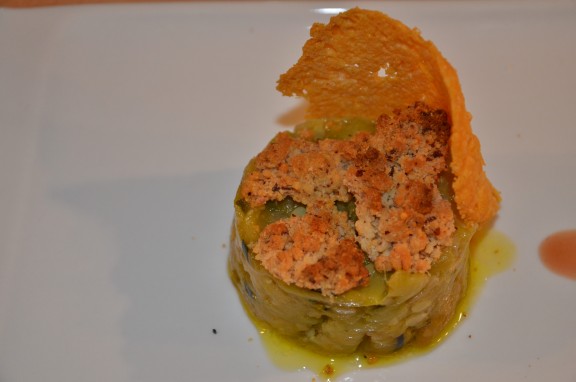 Pour le dressage, disposer le caviar de courgettes dans un cercle en inox et déposer du crumble.