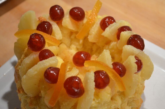 - Couper le reste de l’ananas en petits cubes et en garnir le centre du gâteau en ajoutant éventuellement quelques fruits confits.