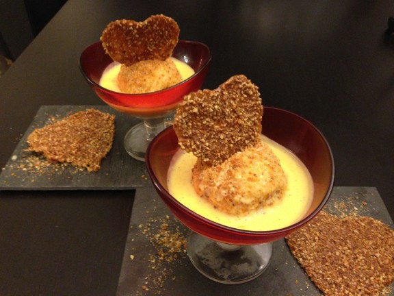 Bon , c’est une recette découverte lors du Top chef 2012, mais j’ai eu envie de la ressortir de mes petits papiers , car , d’une part c’est une façon élégante de sublimer l’ile flottante, d’autre part c’est bientôt la Saint valentin et je trouve que c’est un dessert de Saint Valentin, simple, rapide et efficace!!!