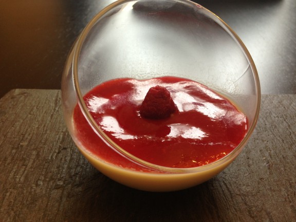 Panna cotta au chocolat blanc, coulis de framboises maison