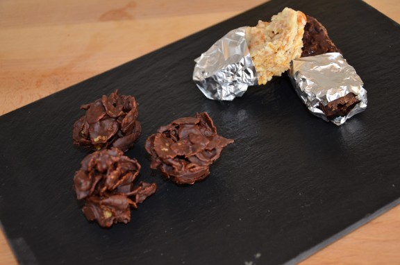 - A l’aide d’un couteau à pain, découper des rectangles et emballer chaque rose des sables dans du papier aluminium ( ce qui facilitera la dégustation)