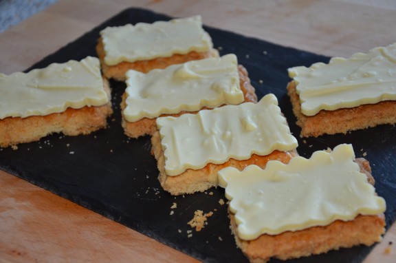 - Fixer sur vos sablés ( utiliser du chocolat blanc fondu, déposer Une goutte dans chaque coin de sablés)