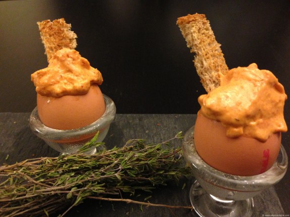 - L’oeuf est disposé dans le coquetier avec la mousse de poivrons dessus et les mouillettes plantées dedans