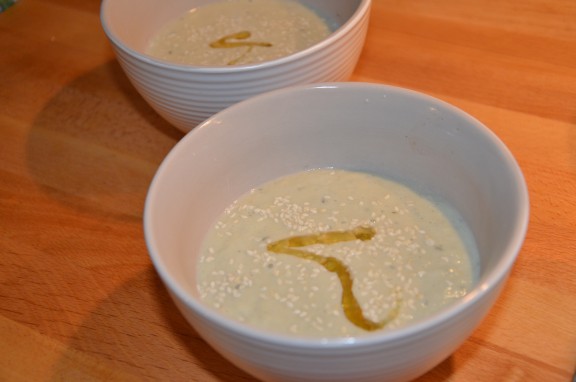 - Verser le velouté dans une assiette creuse, puis le parsemer de graines de sésame et de quelques gouttes d’huile de sésame..