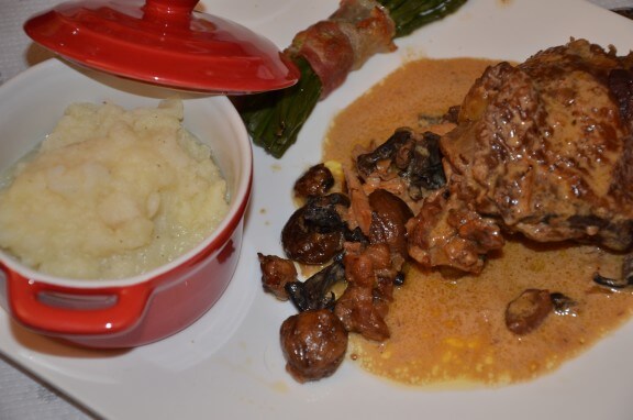 Dresser dans un plat de service, les morceaux de chapon, les marrons et nappez avec la sauce aux morilles.