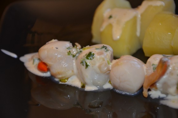J’aime servir ces noix de Saint Jacques avec des pommes de terre vapeur, tout simplement; mais elles s’accommode tout aussi bien avec du riz, des pâtes ou même en salade, sur de la mâche.