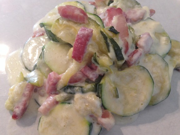 Une recette trouvé sur le site  » un siphon fon fon » , qui elle même l’a trouvé sur le site  » une tortue dans la cuisine » , qui elle même…  bref, la cuisine , un éternel partage et échange. Cette recette a pour intitulé : Courgettes à la carbonara !