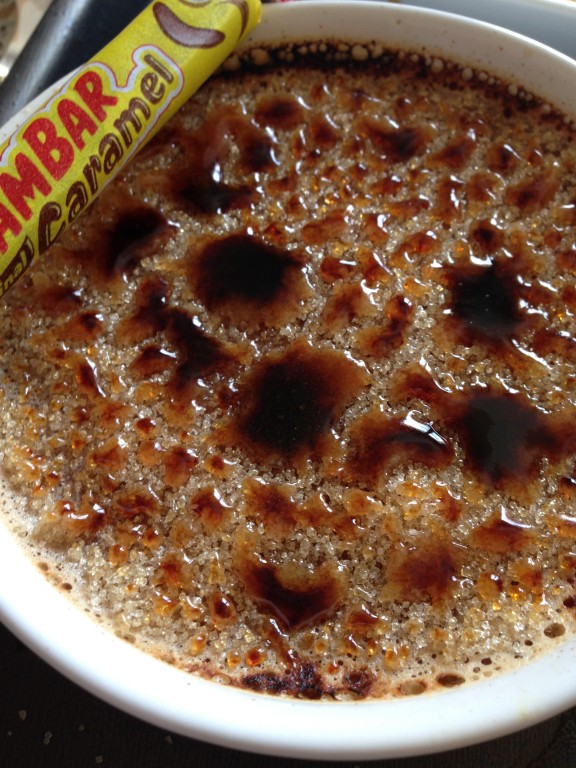 Ici, la recette plus en détail et un peu retravaillée à ma sauce de la crème brûlée au carambar.