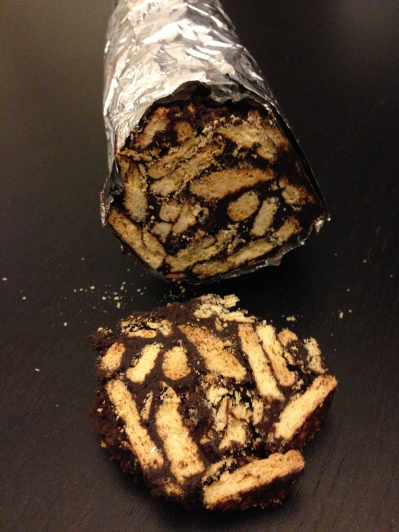 Pour que cela ressemble plus à un saucisson, une fois le papier d’alu enlevé, saupoudrer de sucre glace.