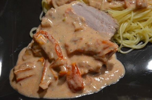 J’ai réalisé en parallèle une sauce , à la crème au porto et aux tomates séchées, pour accompagner mon rôti de veau que je trouve juste sublime … Libre à vous d’accompagner ce plat de pommes de terre vapeur , de pâtes fraîches, de riz…`